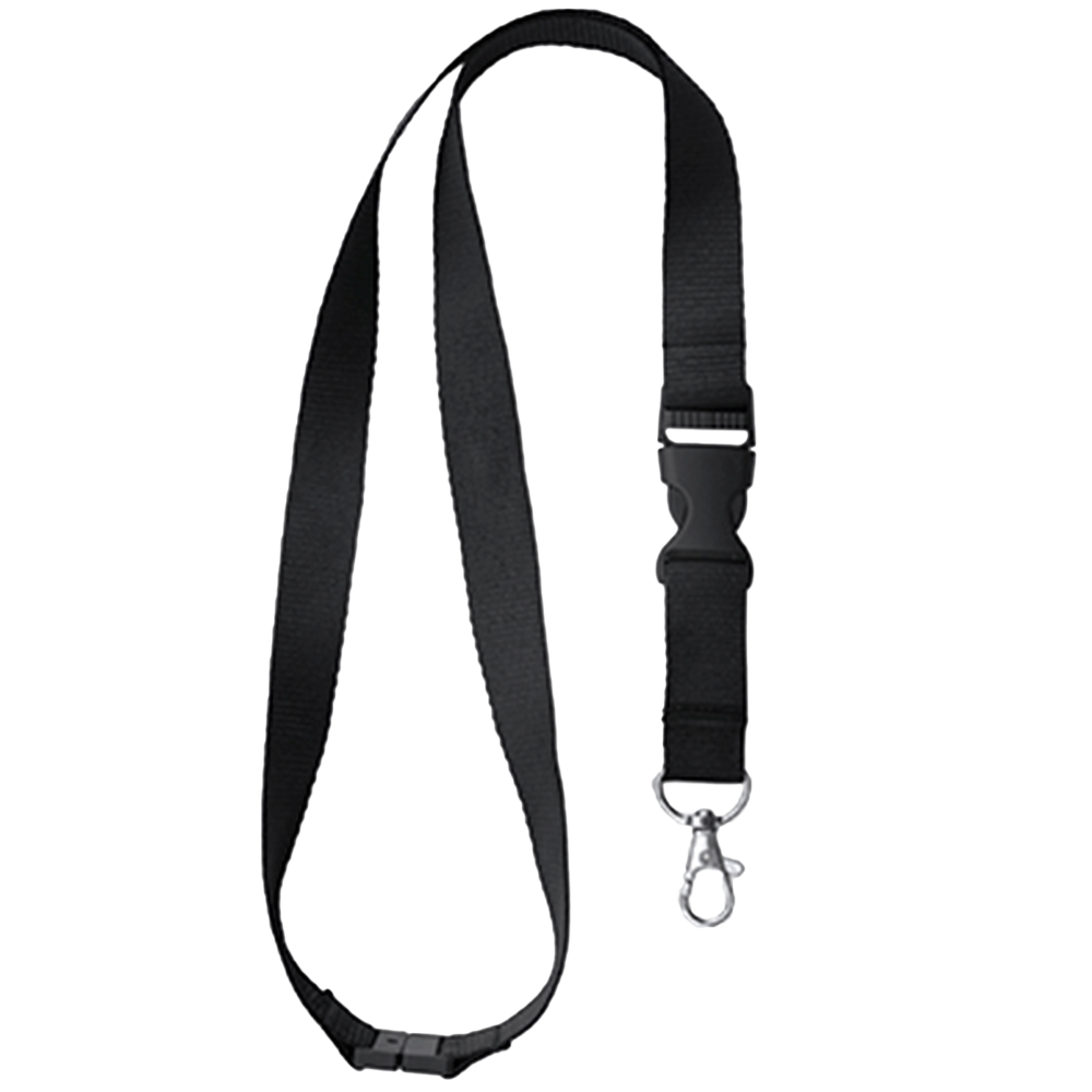 Lanyard de poliéster con mosquetón, hebilla y cierre de seguridad.