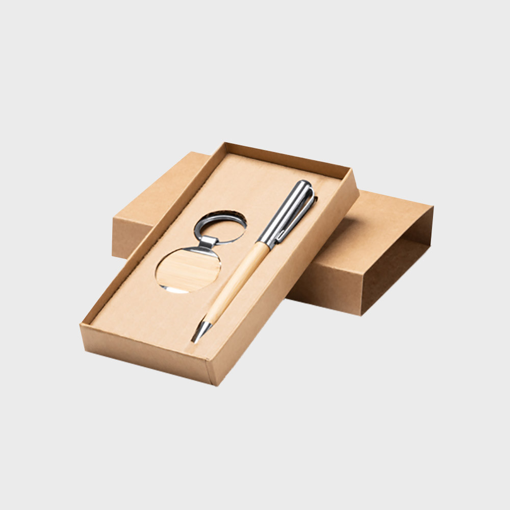En este set puedes personalizar la tapa del estuche, el llavero en ambas caras y el bolígrafo en la parte metálica y de madera.