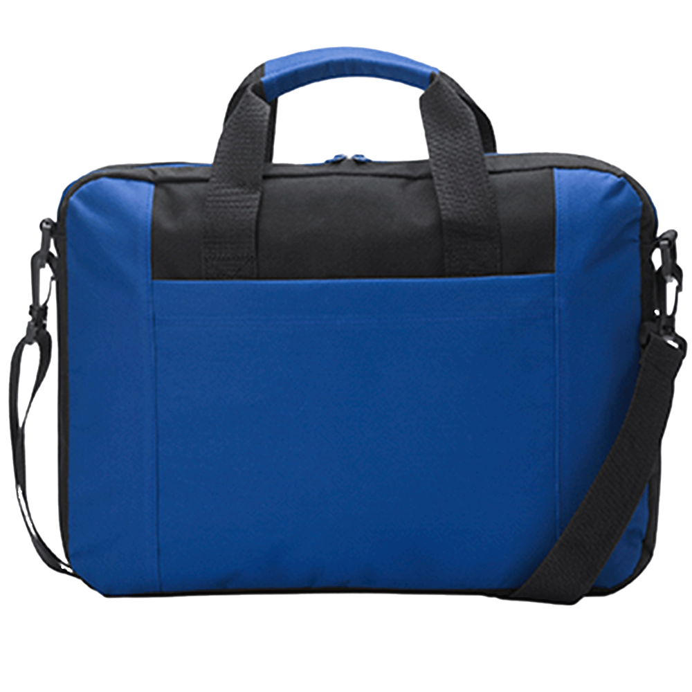 Portadocumentos acolchado para portátil en suave poliéster 600D con bolsillo exterior. Asas de transporte a juego y cinta bandolera ajustable con mosquetón.