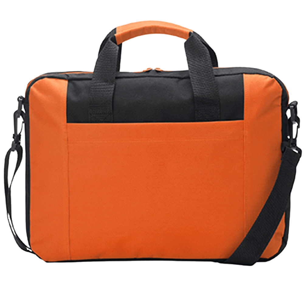 Portadocumentos acolchado para portátil en suave poliéster 600D con bolsillo exterior. Asas de transporte a juego y cinta bandolera ajustable con mosquetón.