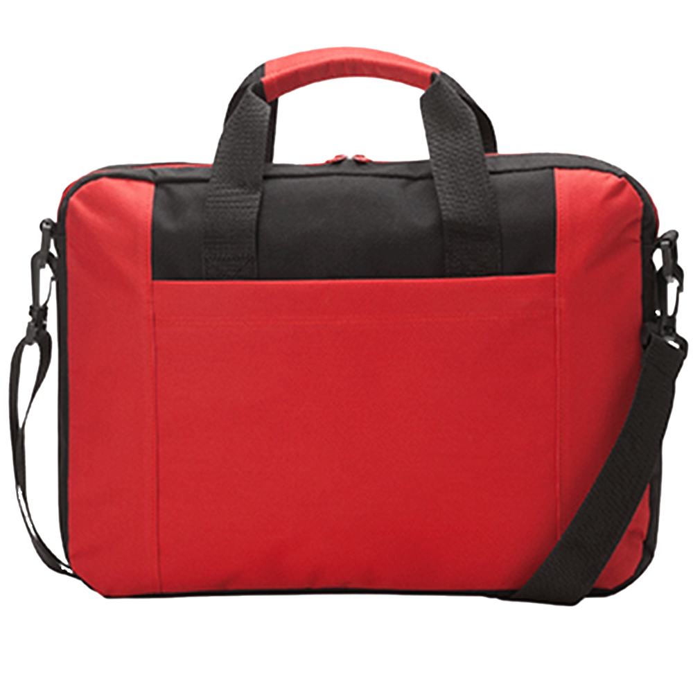 Portadocumentos acolchado para portátil en suave poliéster 600D con bolsillo exterior. Asas de transporte a juego y cinta bandolera ajustable con mosquetón.