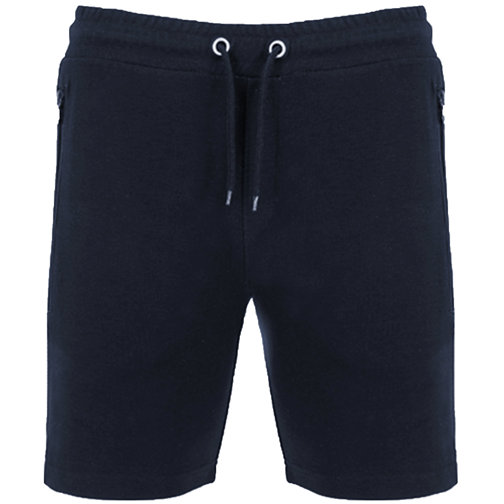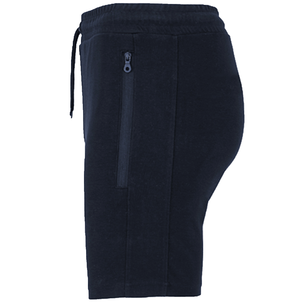 Pantalón corto deportivo con cintura elástica y cordón ajustable con ojales metálicos. Dos bolsillos laterales con cremalleras invertidas a tono y tirador