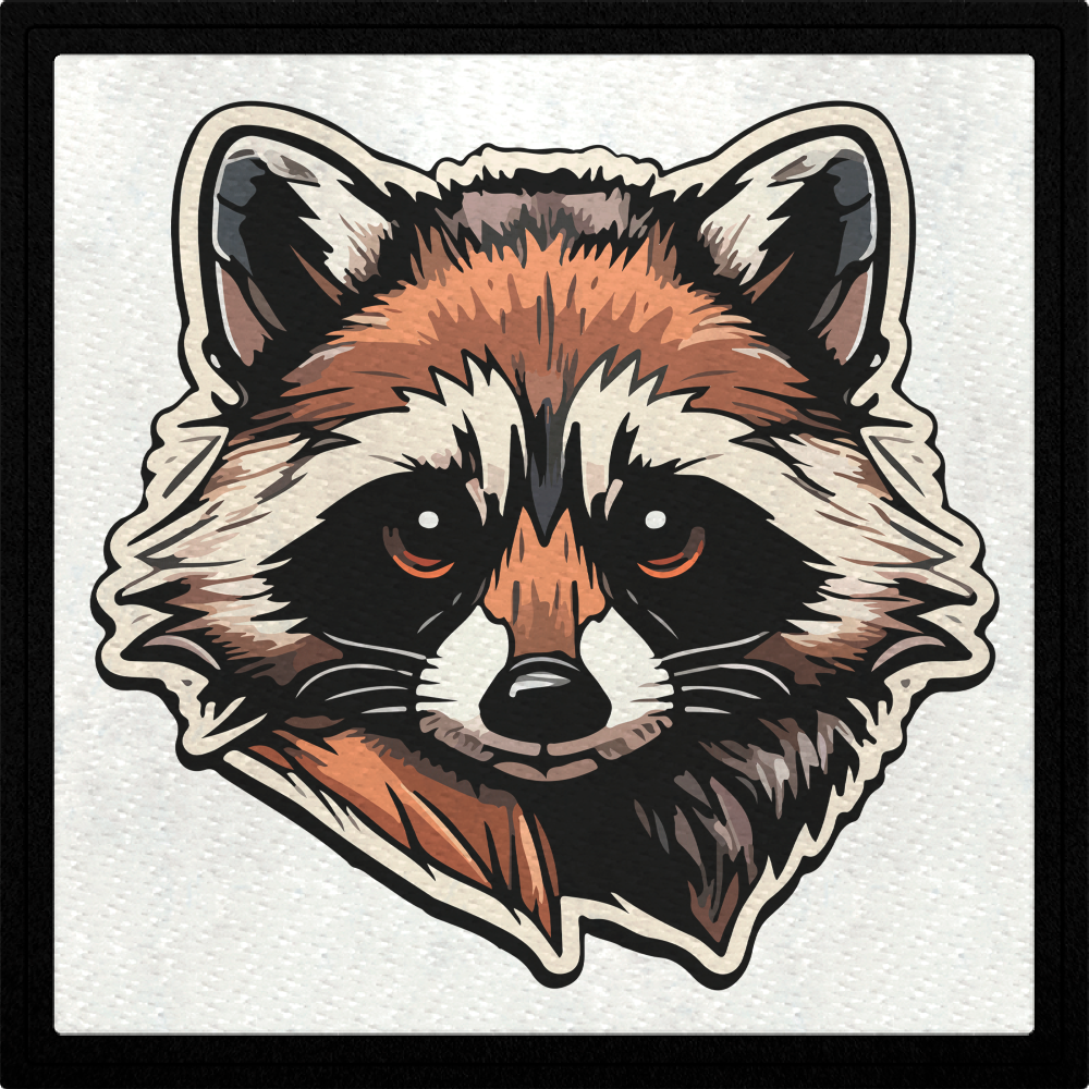 Parche stick DTF Eco flock negro con diseño de procyon lotor.