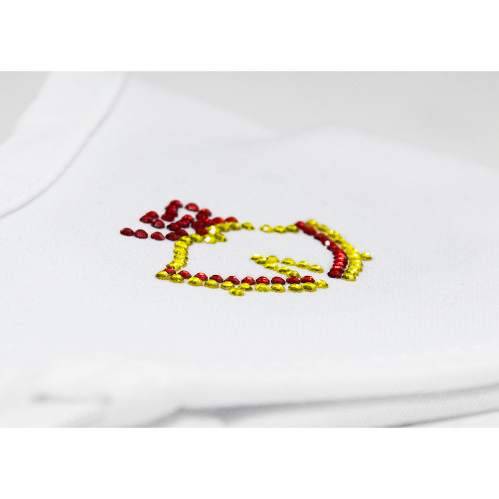 - Nuestro parche de brillantes va protegido con un plástico transportador transparente y una trasera blanca que debes retirar antes de planchar.