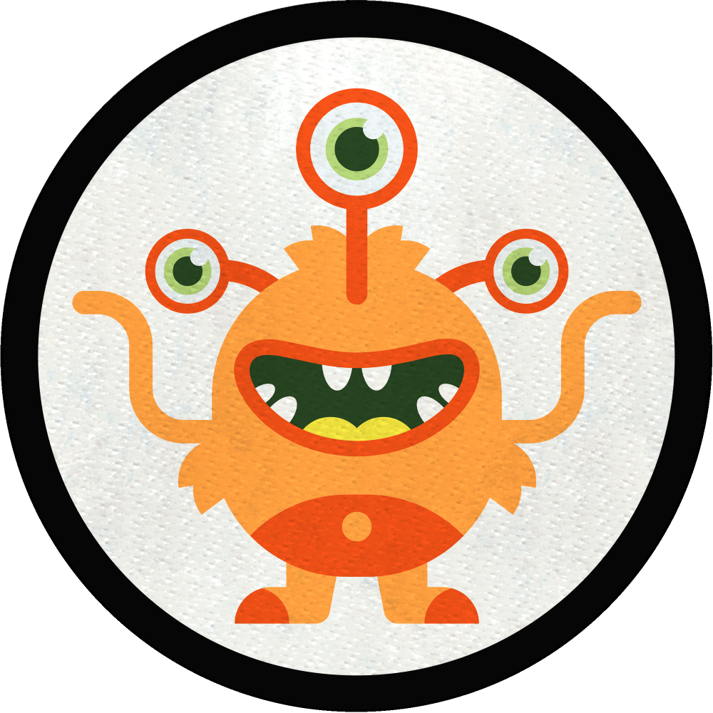 Parche stick DTF Eco flock negro con diseño de monstruo naranja con 3 ojos.