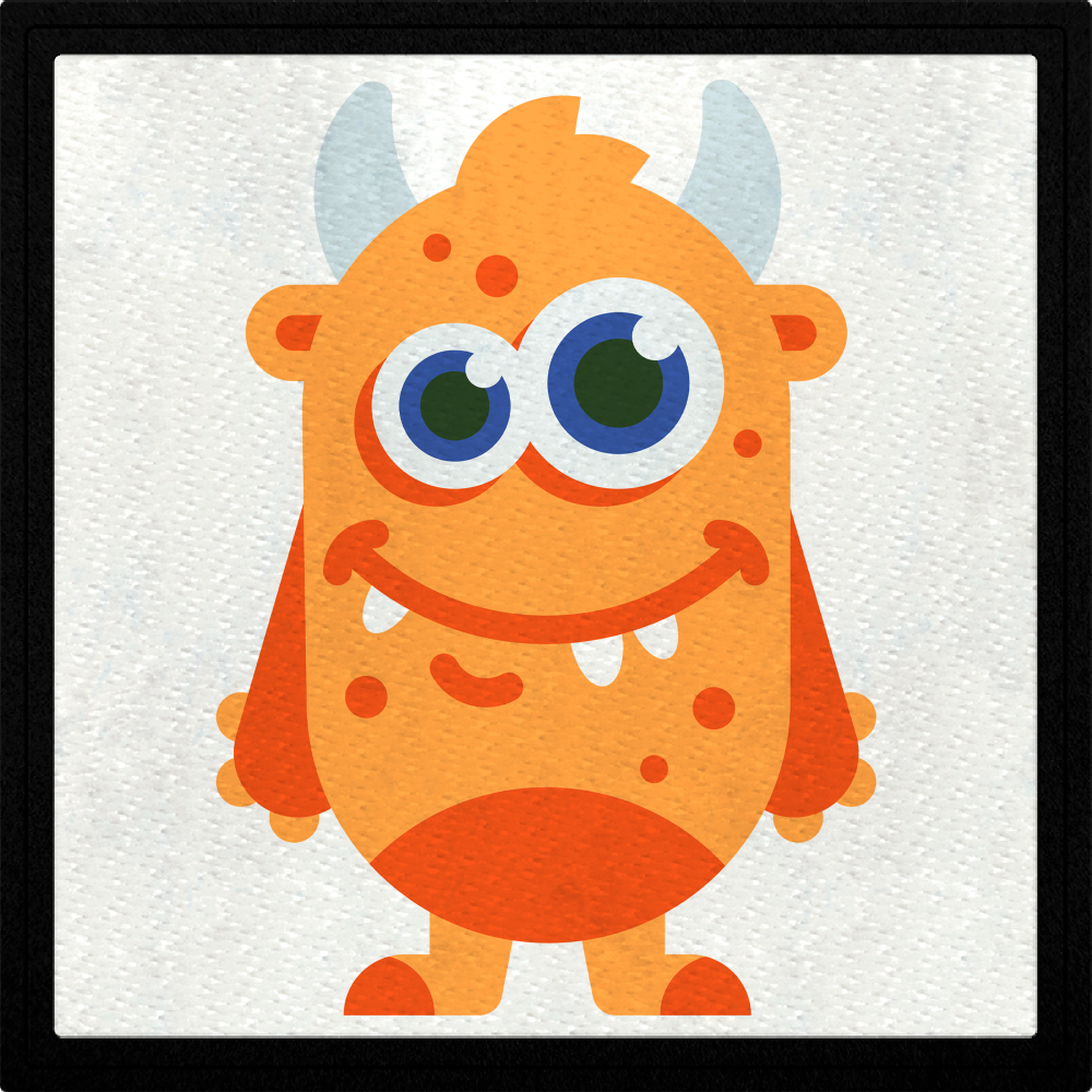 Parche stick DTF Eco flock negro con diseño de monstruo naranja con sonrisa.