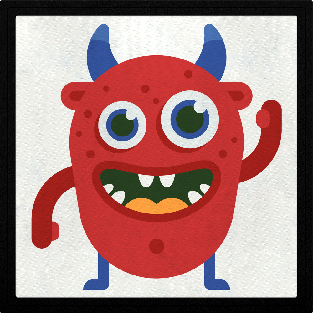 Parche stick DTF Eco flock negro con diseño de monstruo rojo.