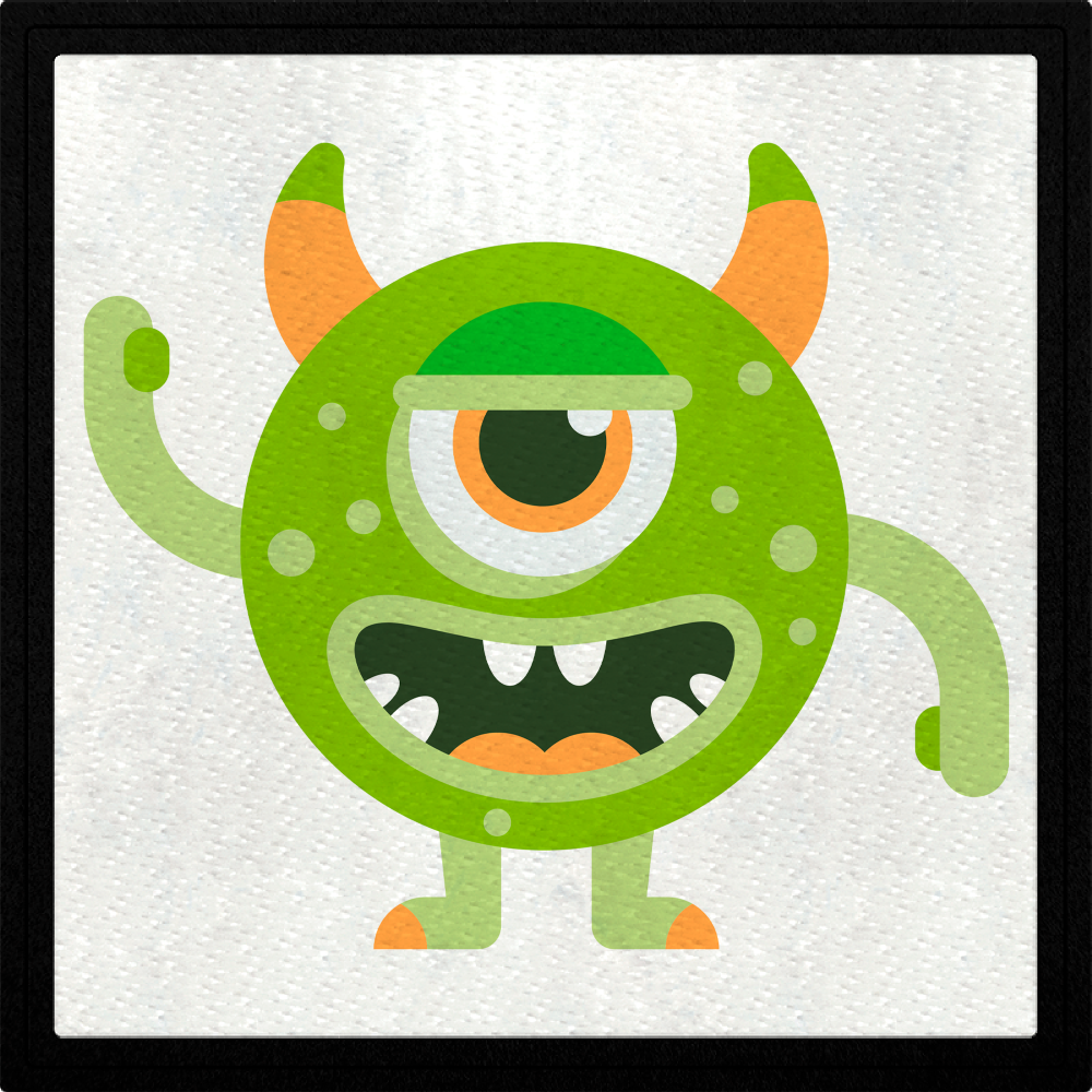 Parche stick DTF Eco flock negro con diseño de monstruo verde con 1 ojo.