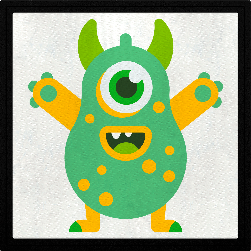Parche stick DTF Eco flock negro con diseño de monstruo verde con puntos naranjas.