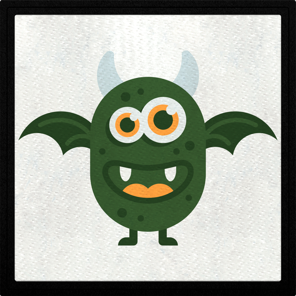 Parche stick DTF Eco flock negro con diseño de monstruo con alas verdes.