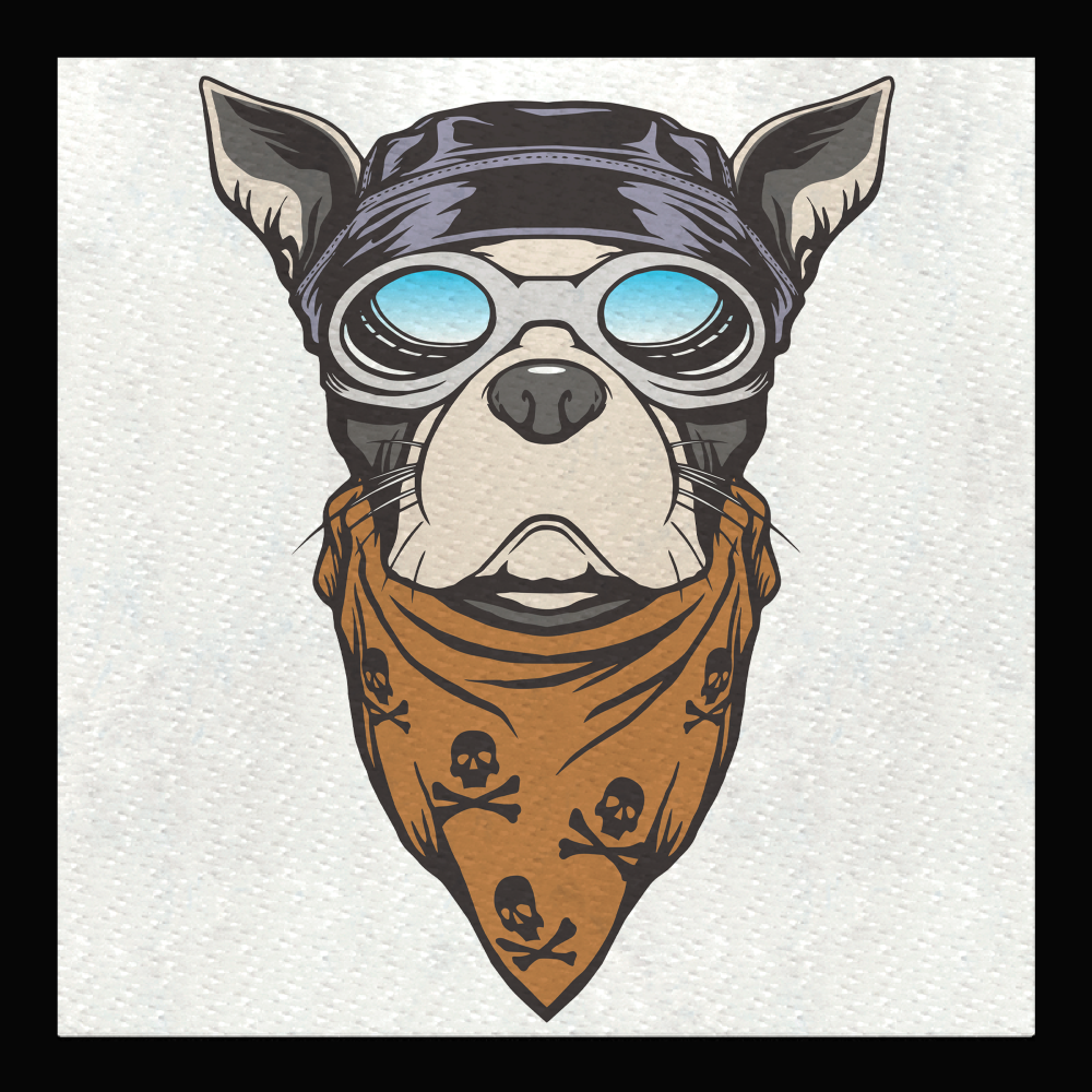 Parche stick DTF Eco flock negro con diseño de cabeza de perro motero.