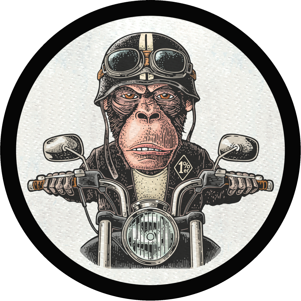 Parche stick DTF Eco flock negro con diseño de primer mono motero.