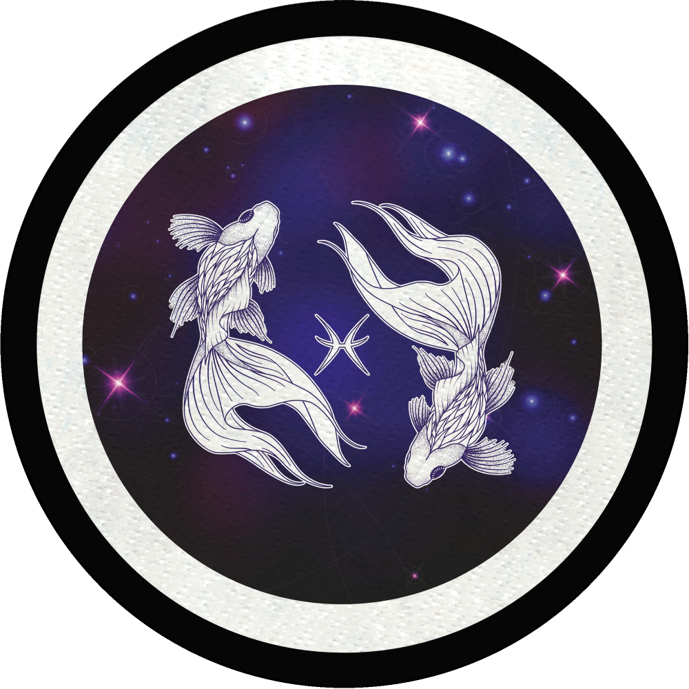 Parche stick DTF Eco flock negro con diseño de círculo astral piscis.