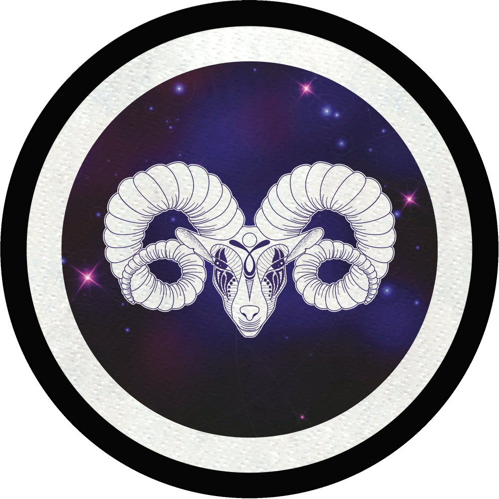 Parche stick DTF Eco flock negro con diseño de círculo astral aries.