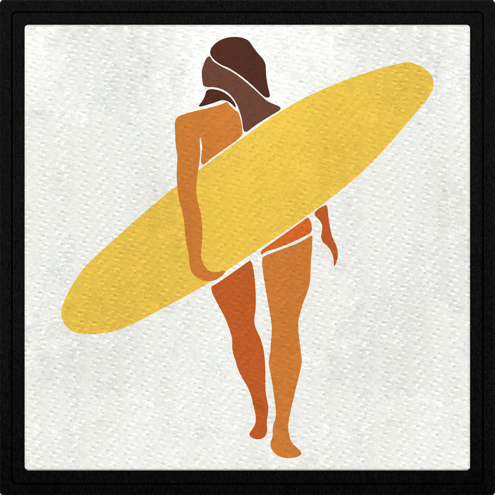 Parche stick DTF Eco flock negro con diseño de silueta mujer surfera.