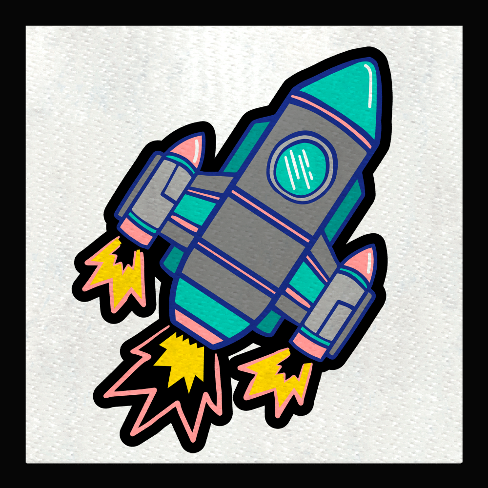 Parche stick DTF Eco flock negro con diseño de cohete con tres impulsores.