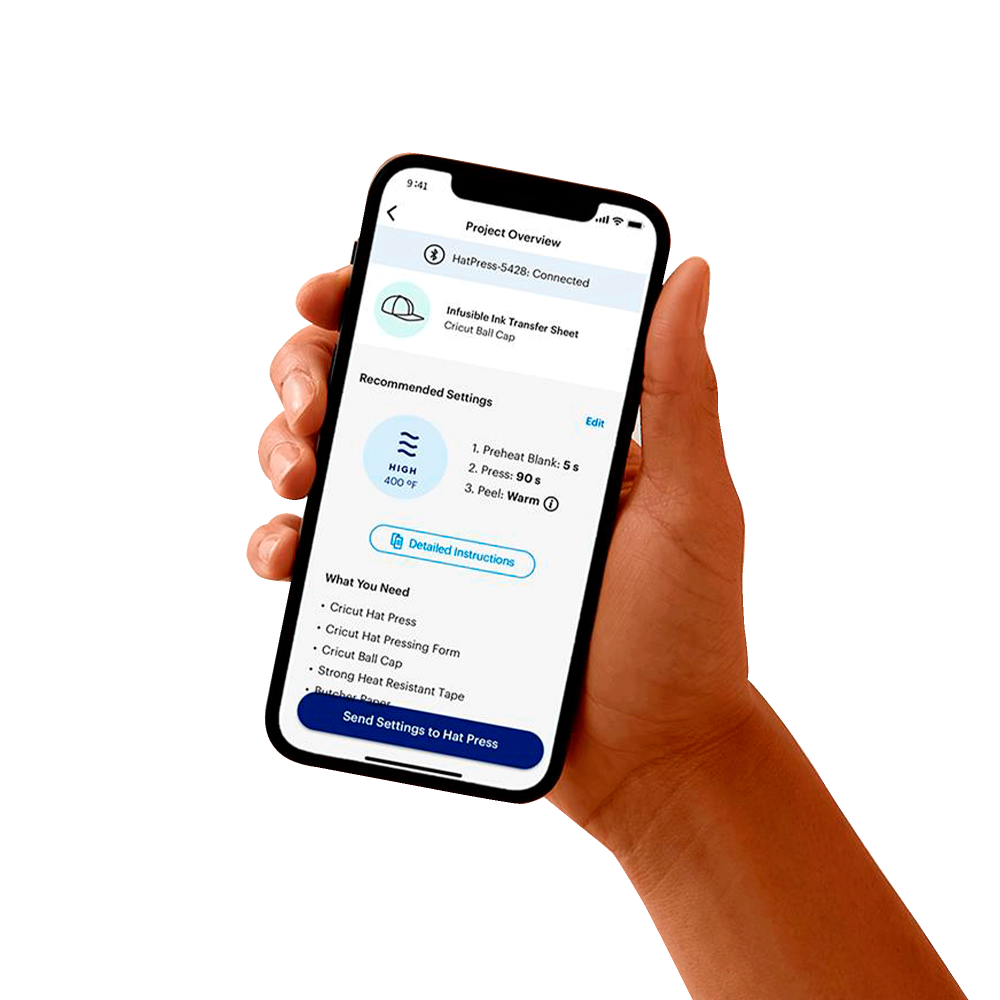 - Haz clic para que la aplicación mande a tu plancha Hat Press los ajustes precisos de tiempo y temperatura.
