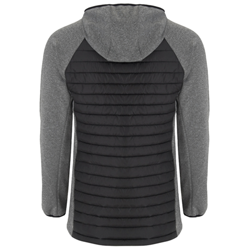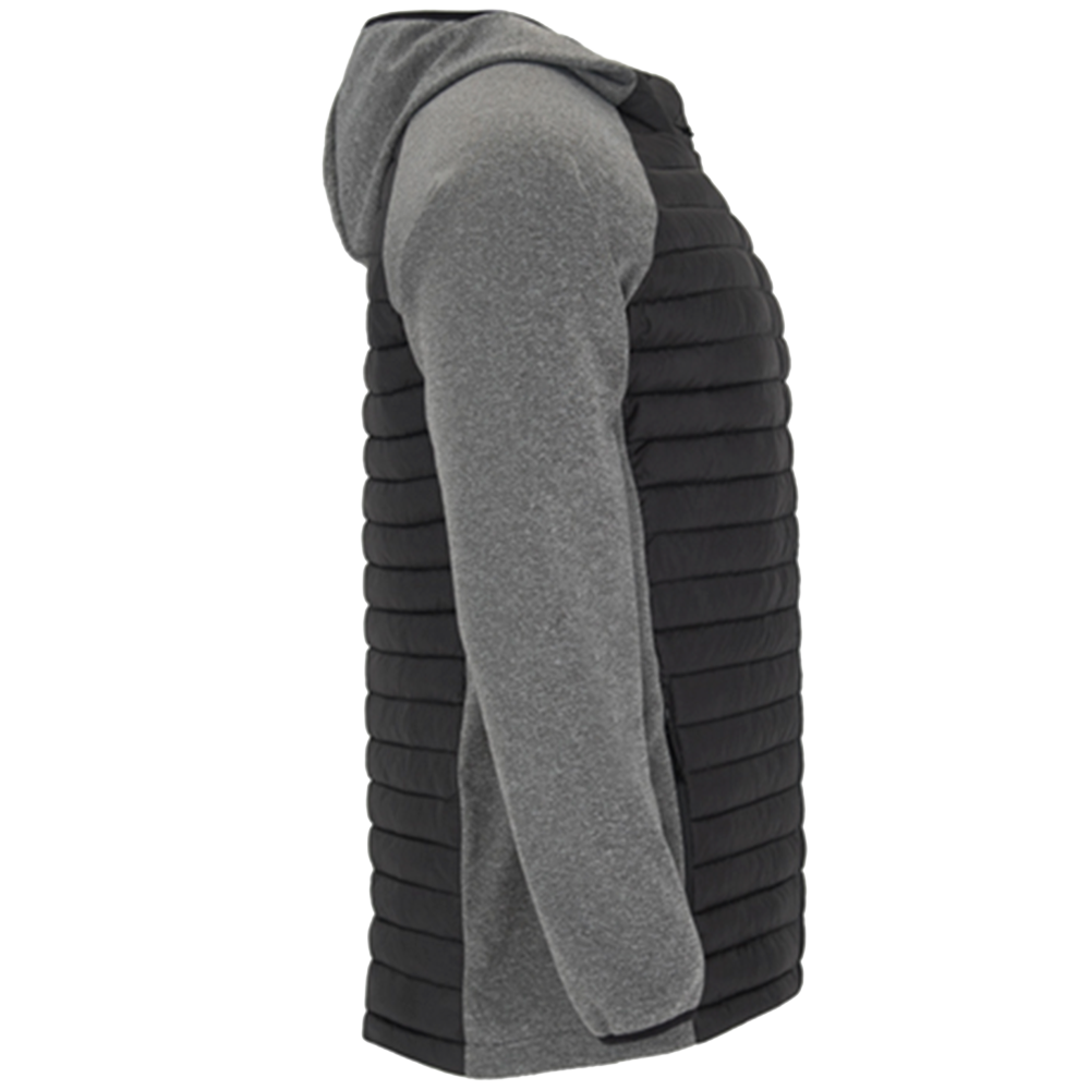 Capucha fija ajustada, manga ranglán, tejido softshell en mangas, panales laterales y tejido acolchado tacto pluma en frontal y espalda.