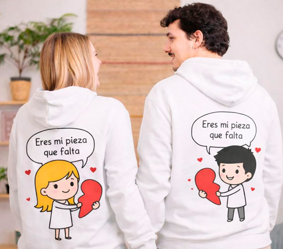 Si os encanta pasar tiempo juntos en casa, las sudaderas a juego y los pijamas personalizados son un acierto seguro. Son perfectos para las noches de peli y manta, para el fin de semana o simplemente para estar cómodos en el sofá. Puedes personalizarlos con vuestros nombres, iniciales, una fecha especial o un diseño que encaje con vuestra forma de ser, desde algo muy romántico hasta algo divertido.