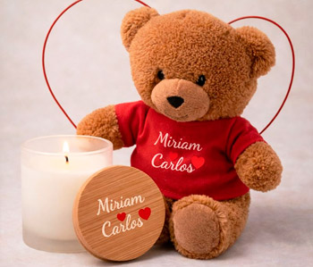 Un detalle tierno y romántico: un osito de peluche personalizado junto a una vela aromática para crear un rincón acogedor donde sorprender a tu pareja.