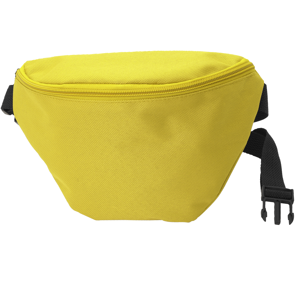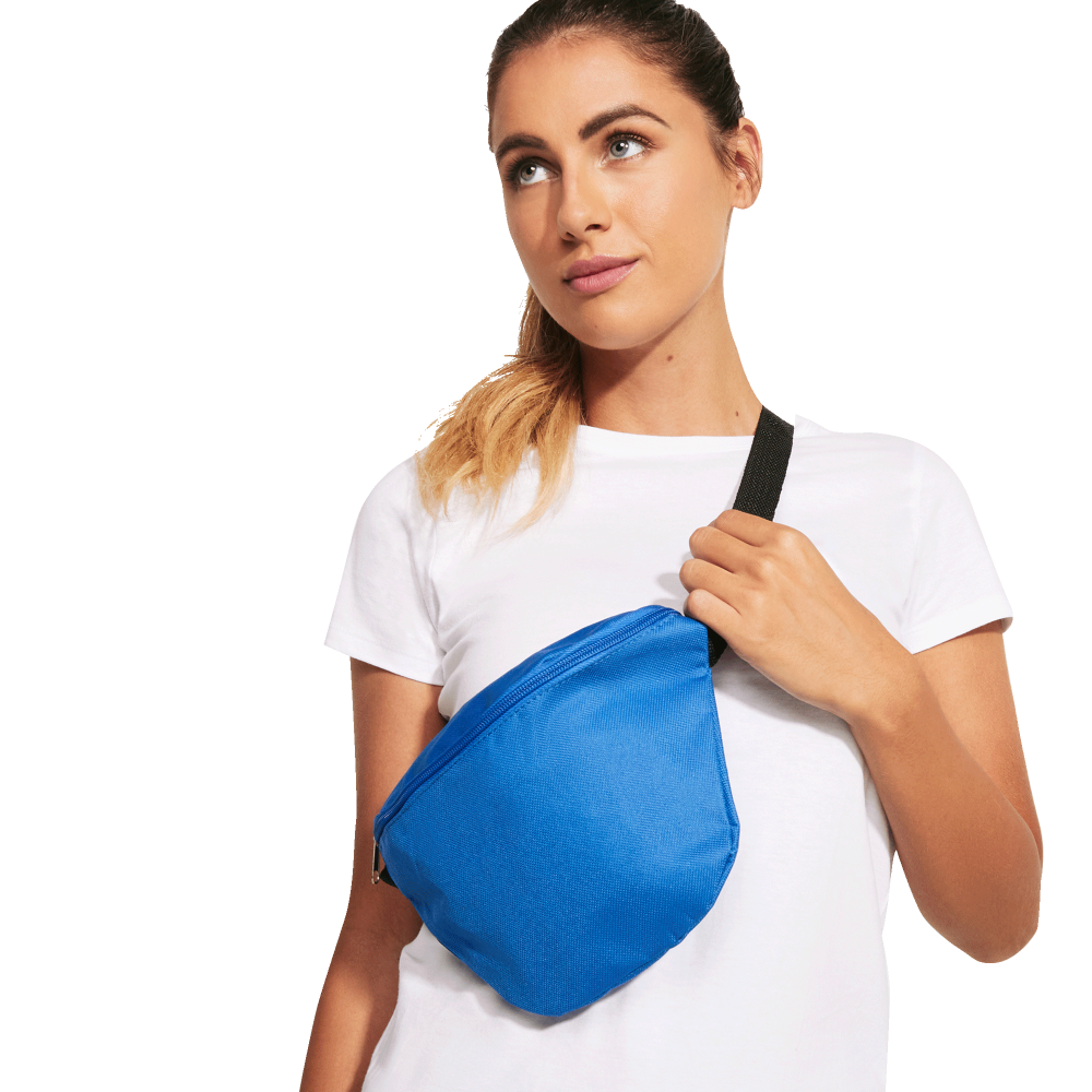 Riñonera de poliéster con un bolsillo frontal y otra trasero con cremalleras y tiradores a juego