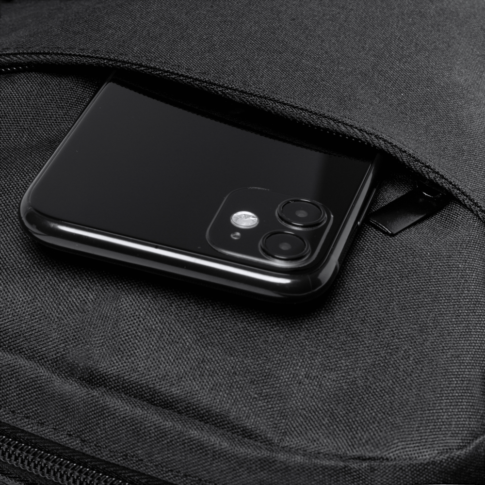 Cuenta con un compartimento principal con dos bolsillos interiores y una asa de transporte ajustable