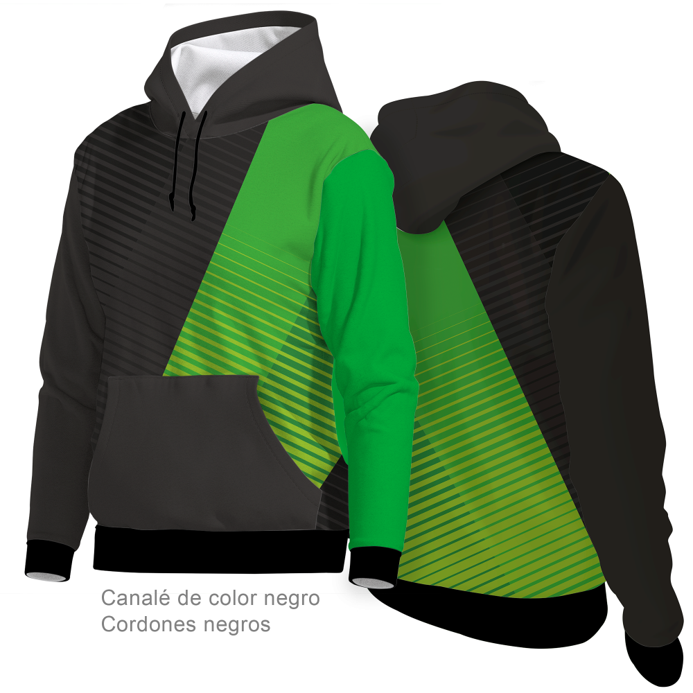 Sudadera con capucha y bolsillo canguro. Manga recta, canalé en cuatro colores a elegir para puños y cintura; cordones de la capucha blancos o negros