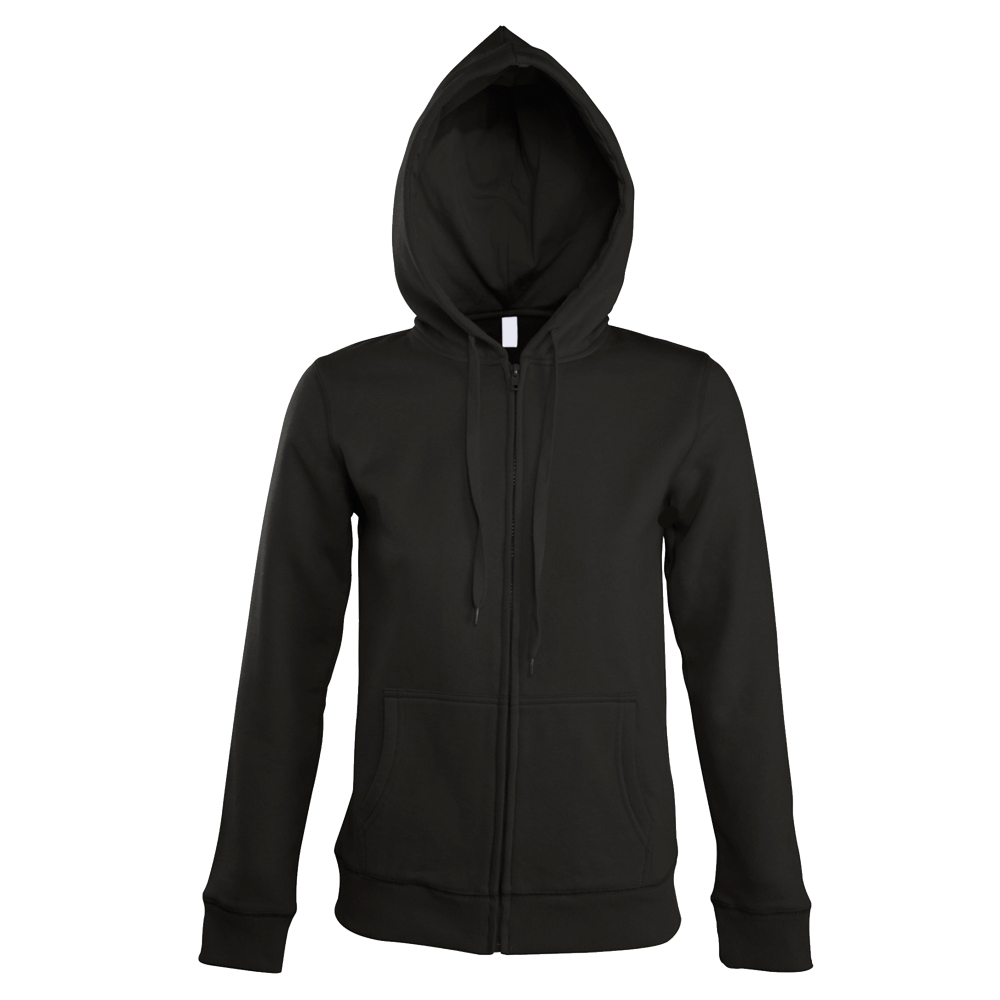 Chaqueta sudadera de mujer con capucha, abertura en medido mediante cremallera oculta y dos bolsillo tipo canguro.