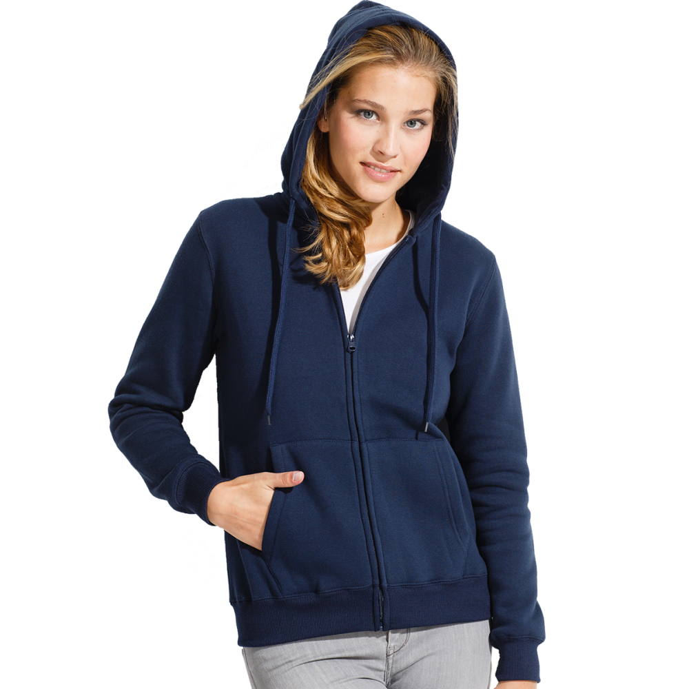 Chaqueta sudadera de mujer con capucha, abertura en medido mediante cremallera oculta y dos bolsillo tipo canguro.