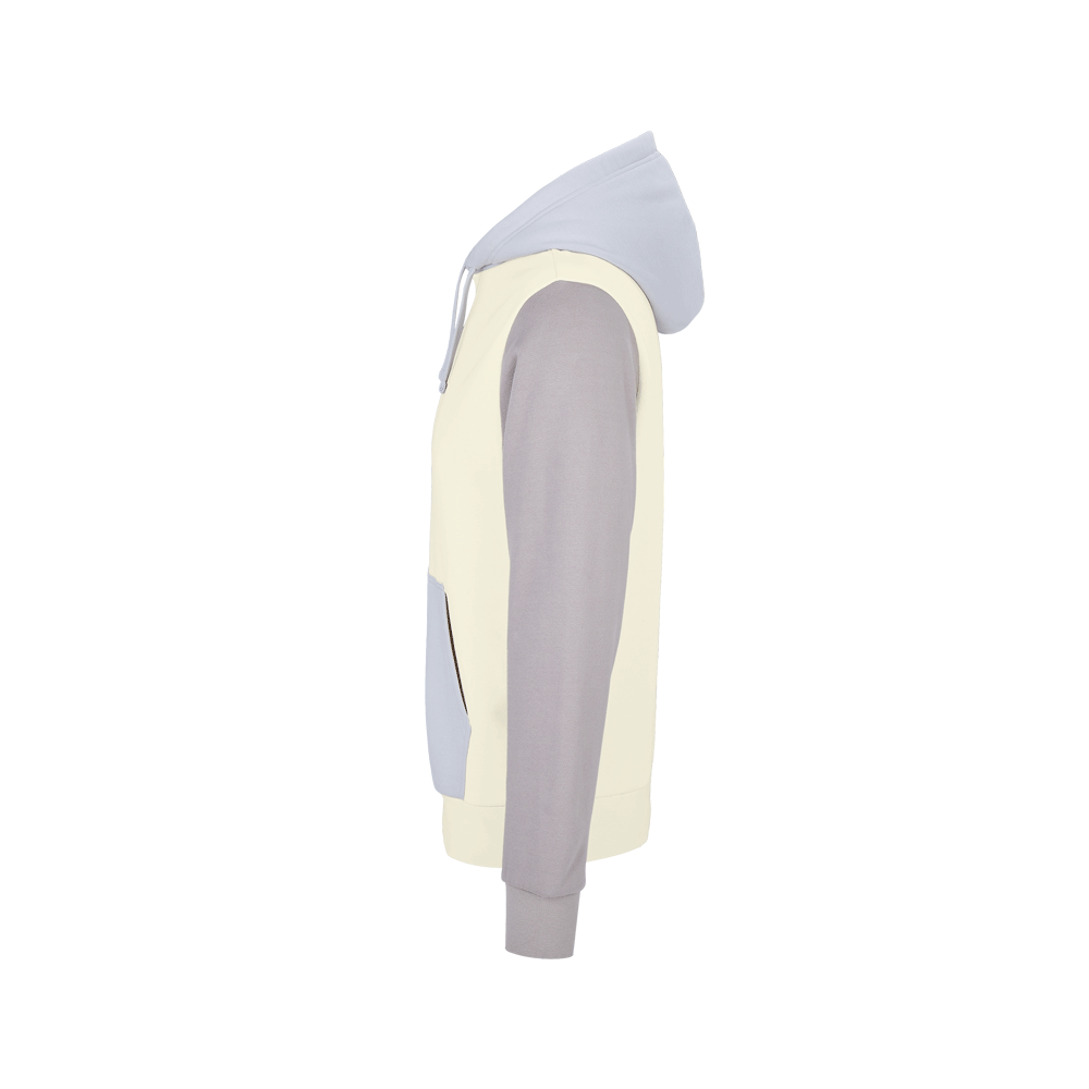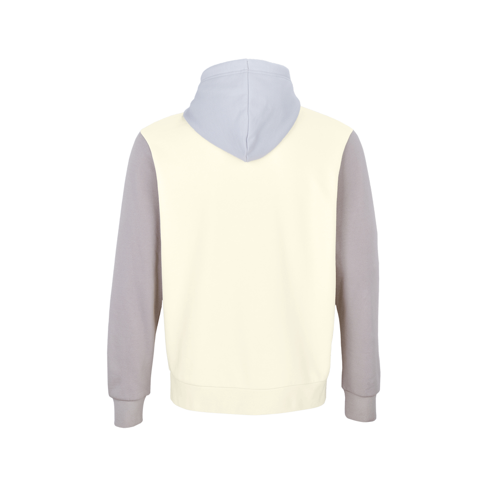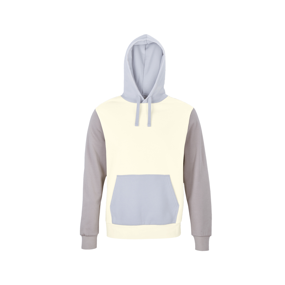 Sudadera unisex con capucha tricolor de 80% algodón orgánico peinado - 20% poliéster reciclado.