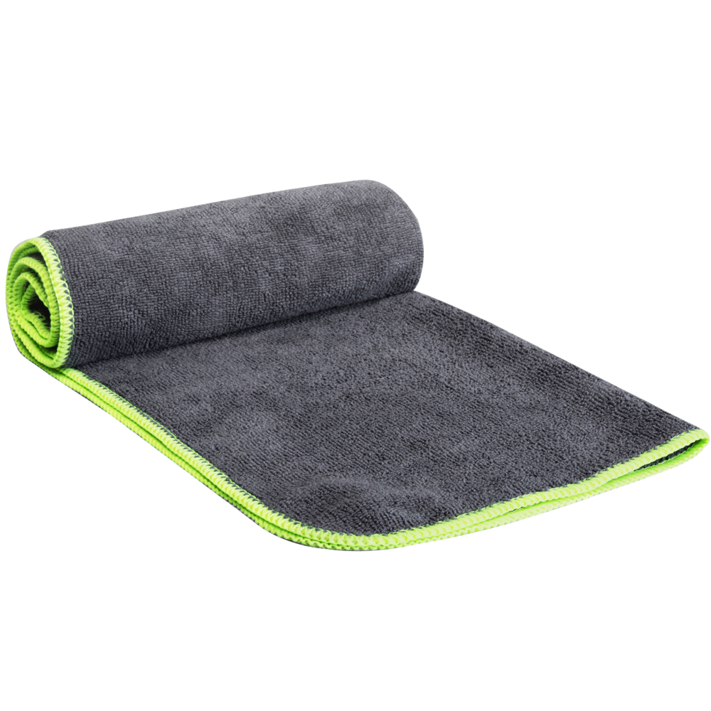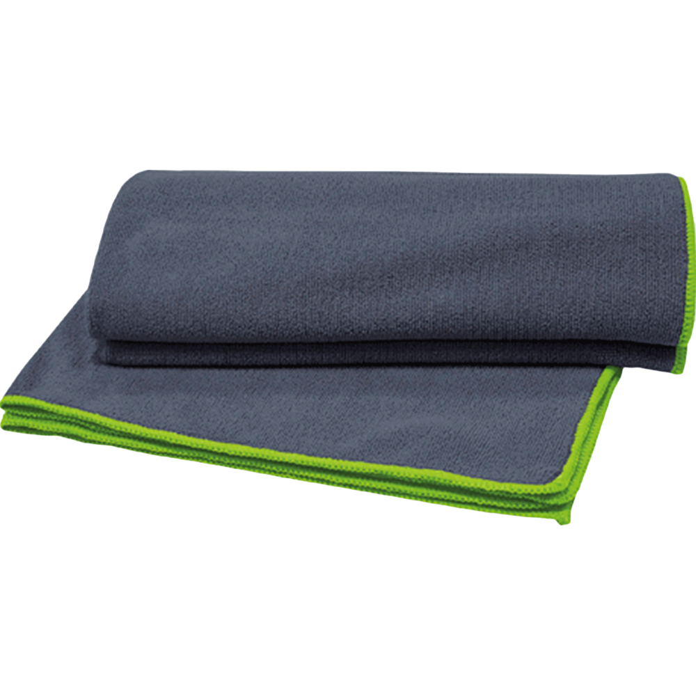 Toalla de baño y playa, remallado con filamento de poliéster a tres hilos mismo tono, excepto en el color plomo oscuro, que el remallado es en amarillo flúor. Adorno elástico para plegado.